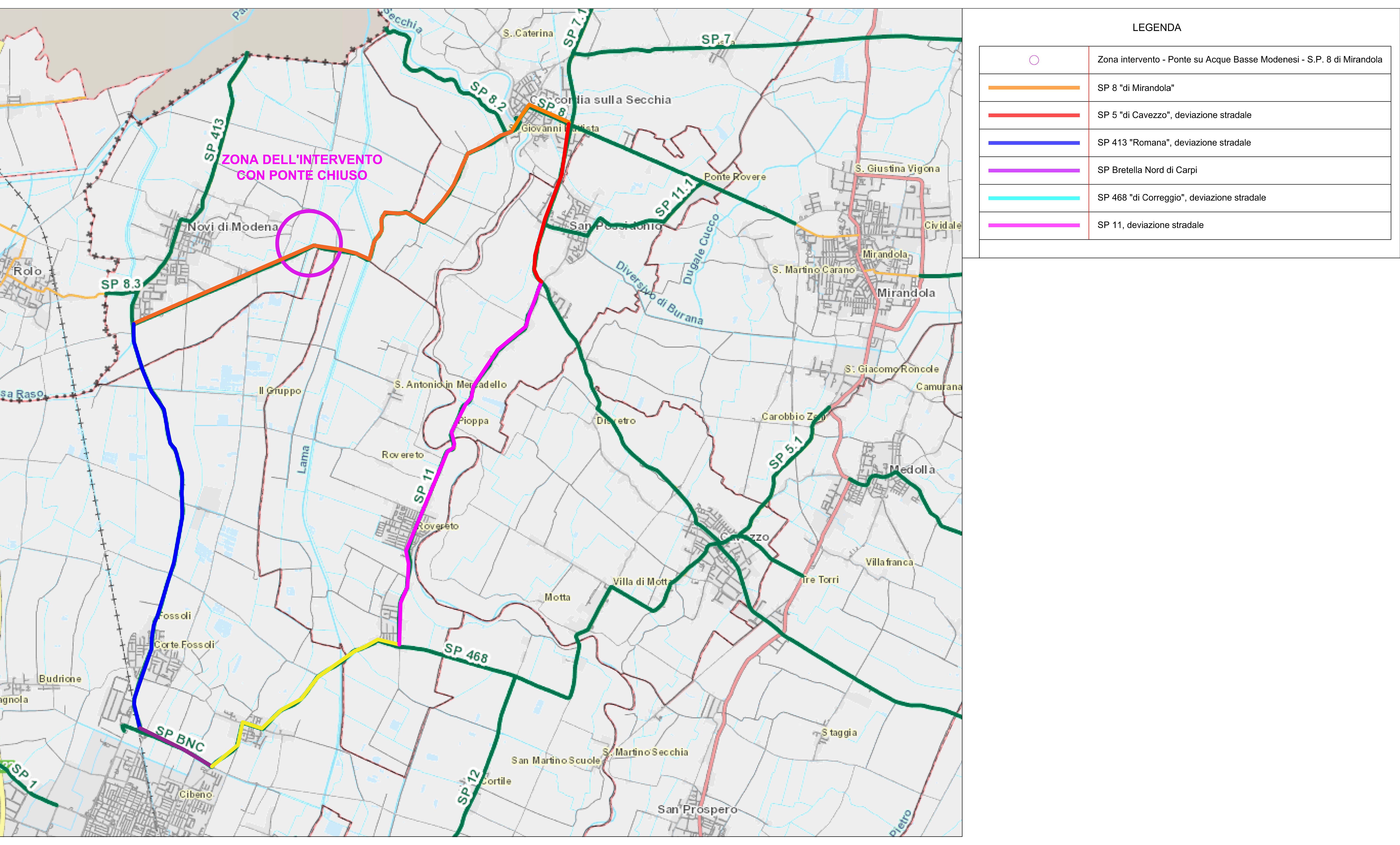 La Provincia di Modena ha disposto la chiusura del ponte sul Canale Acque Basse Modenesi, in Strada Provinciale 8 di Mirandola nel Comune di Novi di Modena, per lavori di manutenzione straordinaria e messa in sicurezza, dalle ore 9.00 del 12 marzo 2026 al 23 aprile 2026,.