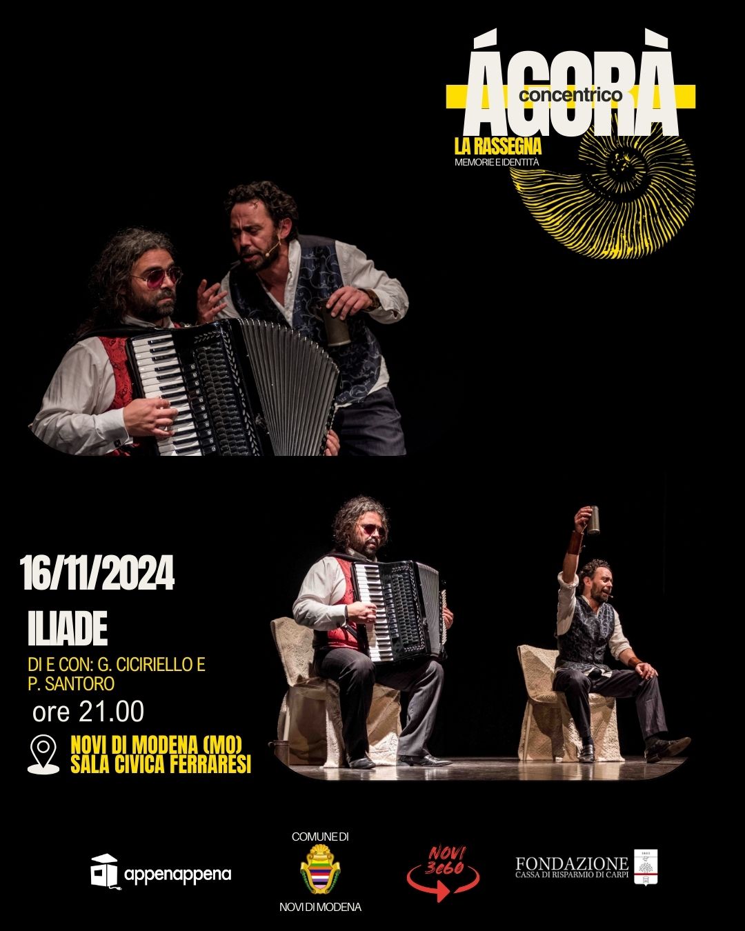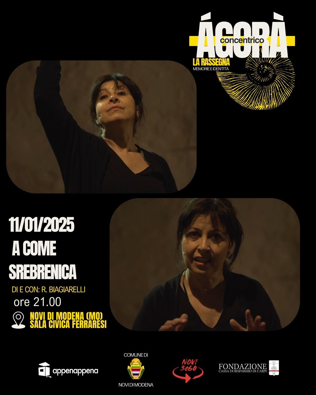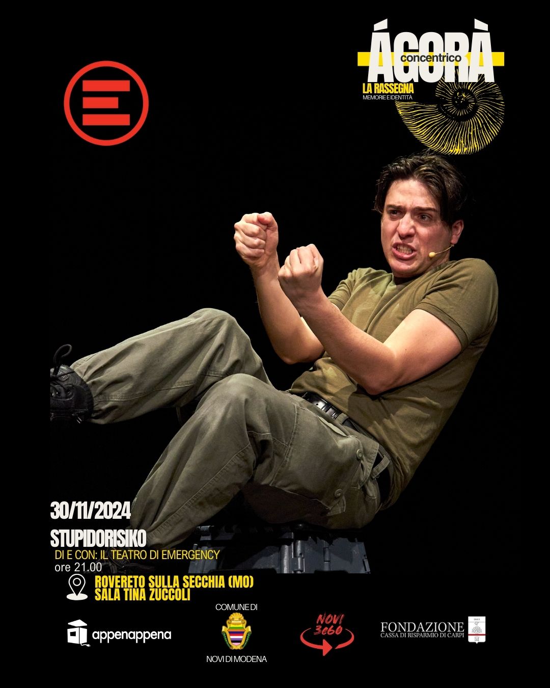 La collaborazione tra l’associazione culturale AppenAppena Aps e il Comune di Novi di Modena continua con la presentazione della rassegna teatrale Concentrico Agorà dal titolo “Memorie e Identità”: tre spettacoli teatrali gratuiti a Novi di Modena e Rovereto s/S per esplorare e condividere le storie che hanno plasmato il nostro passato, illuminando le esperienze umane dietro i grandi conflitti e le trasformazioni sociali. La rassegna è realizzata grazie al contributo della Fondazione Cassa di Risparmio di Carpi e prevede due matinèe dedicati alle scuole secondarie del territorio e repliche serali aperte al pubblico, tutti gli spettacoli saranno a ingresso libero e gratuito.