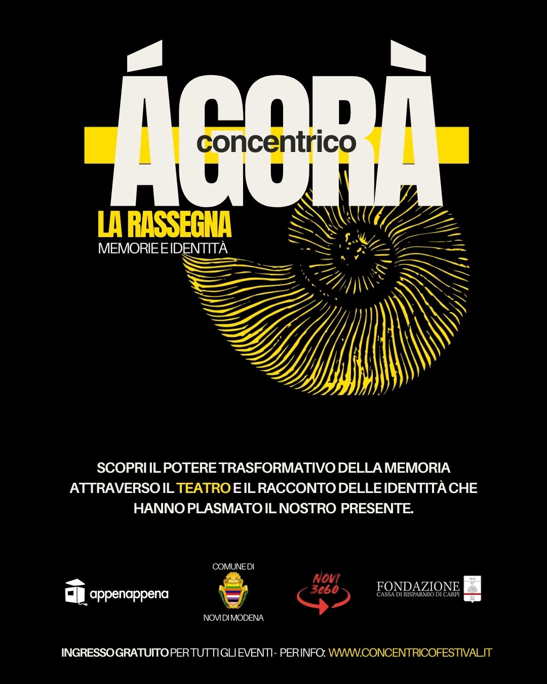 Concentrico Agorà è un progetto realizzato da Associazione culturale AppenAppena in collaborazione con il Comune di Novi di Modena e con il contributo della Fondazione Cassa di Risparmio di Carpi.