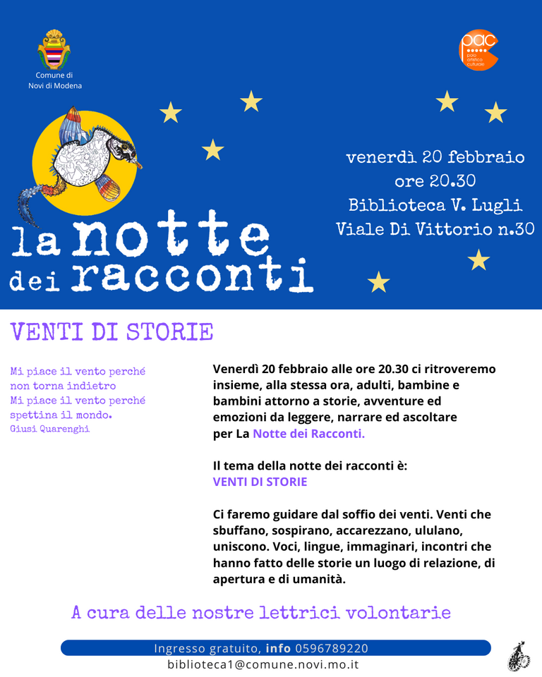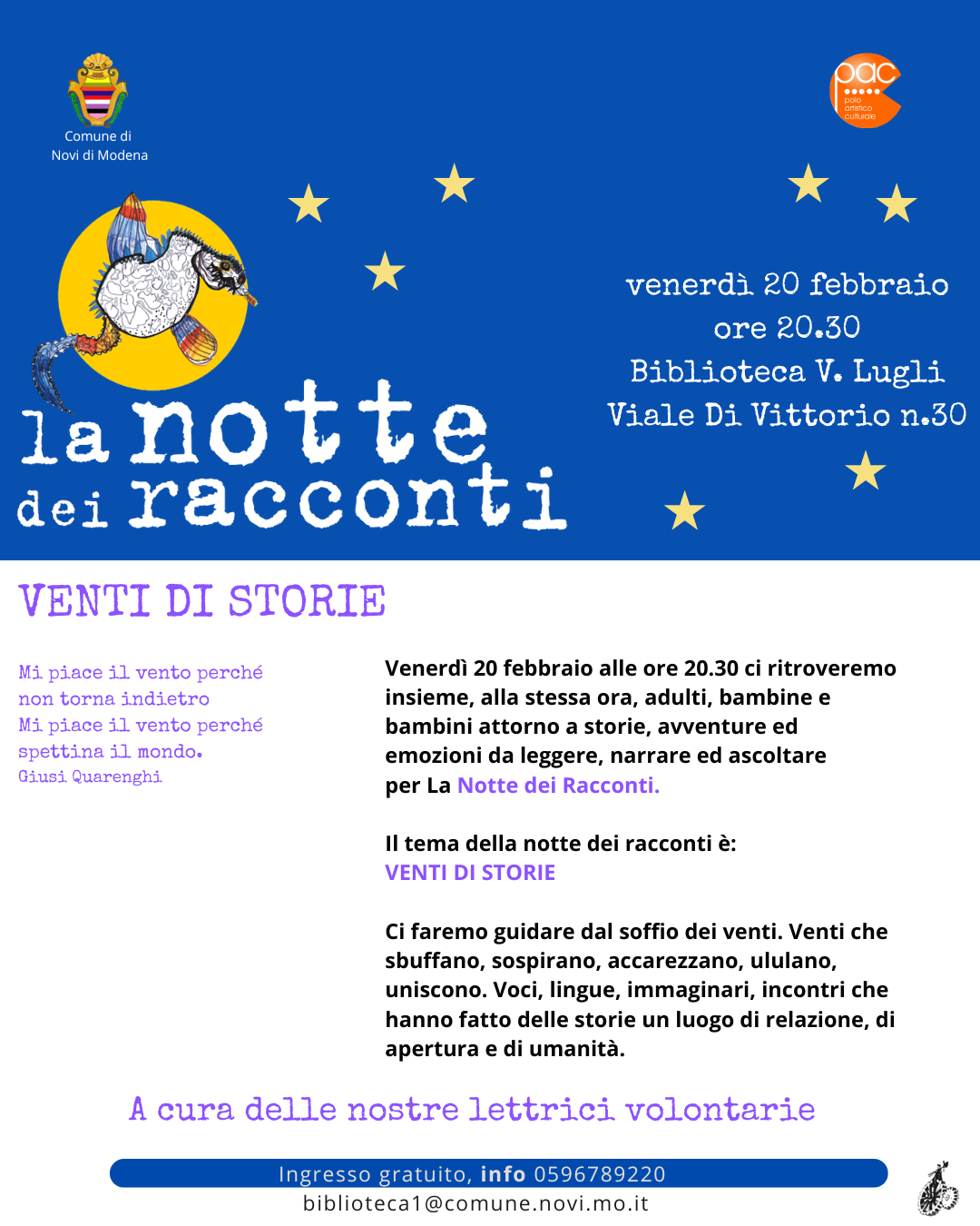 Venerdì 20 febbraio alle ore 20.30 ci ritroveremo insieme, alla stessa ora, adulti, bambine e bambini attorno a storie, avventure ed emozioni da leggere, narrare ed ascoltare per La Notte dei Racconti.